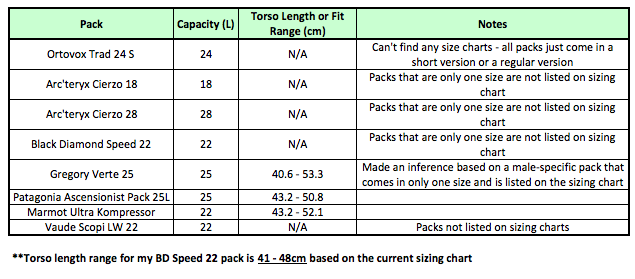 While I was trying to find the torso length ranges for these packs I was going a little cross-eyed, so I opened up Excel…😜 haha! For your reference: